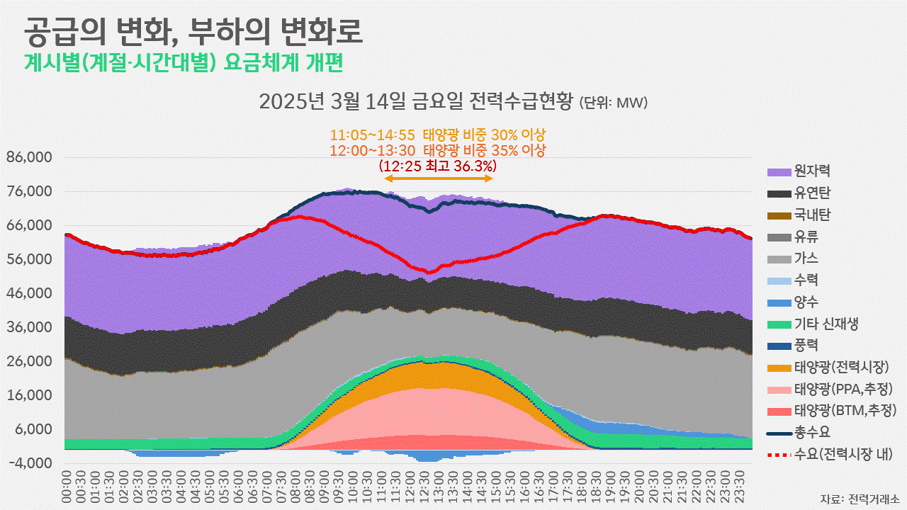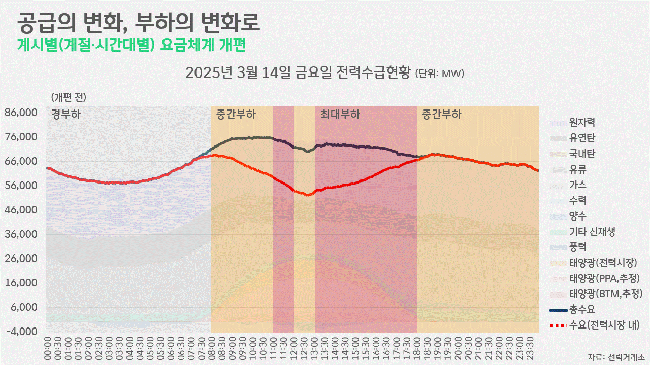 이번에 공개된 개편안 속 전기요금은 '한전이 전기를 판매하는 가격'을 의미합니다. 즉, 전력시장 내 거래되는 수요에 반영되는 가격인 것이죠. 5분 단위의 수요 변화 곡선과 개편 전후 경부하-중간부하-최대부하 시간대를 살펴보면, 개편안이 오후 시간 총수요와 달리 급증하는 순수요를 이동시키는 역할을 꾀하려는 것을 알 수 있습니다. 마치 쌍봉낙타 같은 수요 곡선을 최대한 평탄하게 만드려는 것이죠.