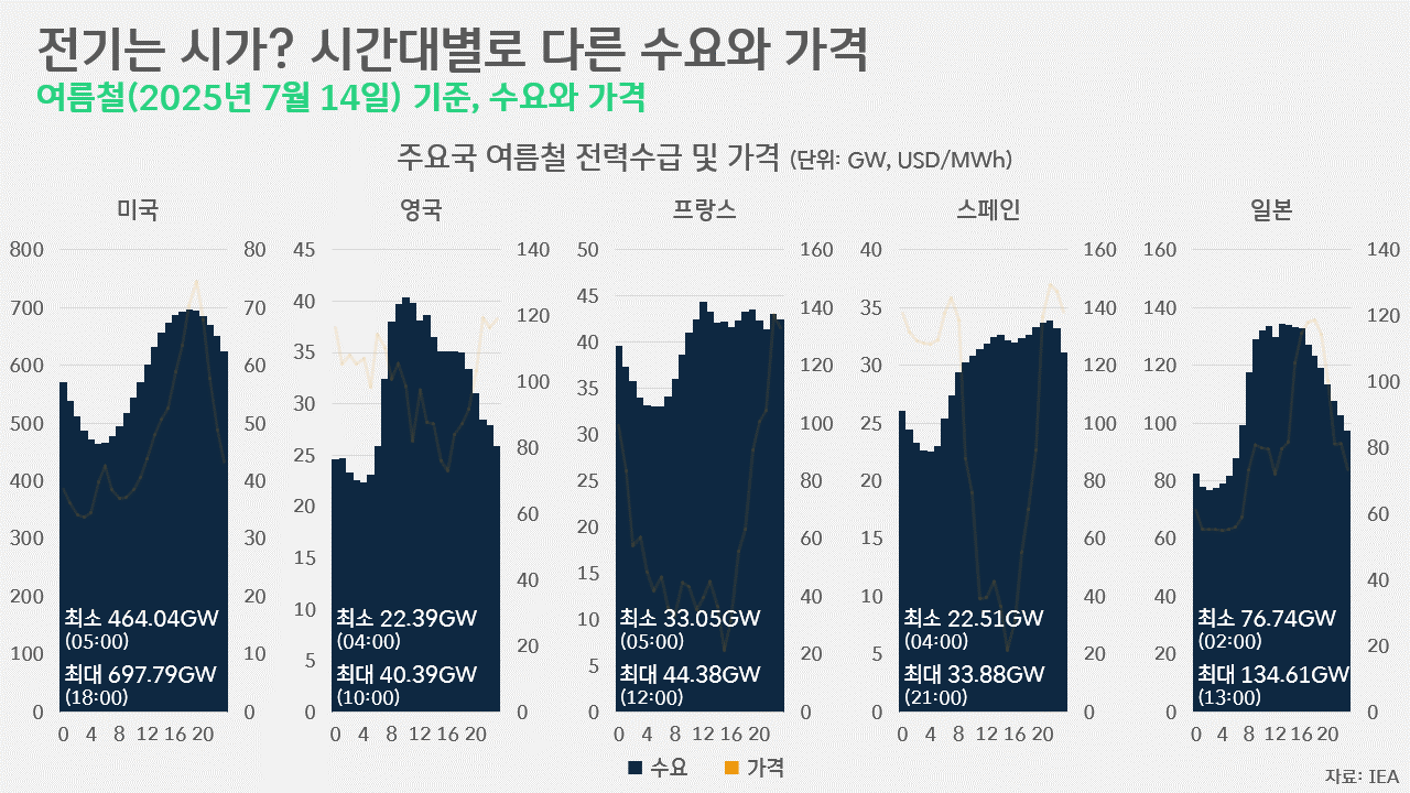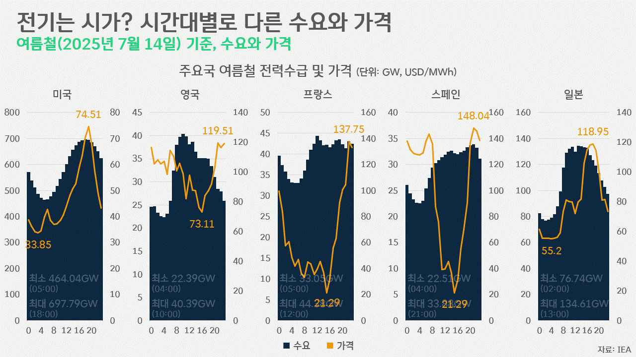 지난 328번째 연재, 〈[박상욱의 기후 1.5] 뒤집어봐야 보이는 것도 있다?〉에서 미국과 유럽의 주요국(영국, 프랑스, 스페인), 그리고 일본의 실제 전력수급 상황과 시간대별로 달라지는 가격에 대해 살펴본 것처럼, 재생에너지로의 전환을 통해 실질적인 수요의 이전을 부르는 가격 격차는 매우 큽니다. 프랑스는 최저 21.29달러/MWh, 최고 137.73달러/MWh, 스페인은 최저 21.29달러/MWh, 최고 148.04달러/MWh로 하루 중에도 최저가가 최고가의 7~15%에 그치죠. 재생에너지로의 전환 속도가 유럽 대비 더딘 미국 조차 최저 33.83달러/MWh, 최고 74.51달러/MWh로 최저가가 최고가의 45%에 불과합니다. 위의 5개국 가운데 하루중 최고-최저 격차가 가장 적은 일본도 최저가(55.2달러/MWh)는 최고가(118.95달러/MWh)의 46%를 기록했죠.