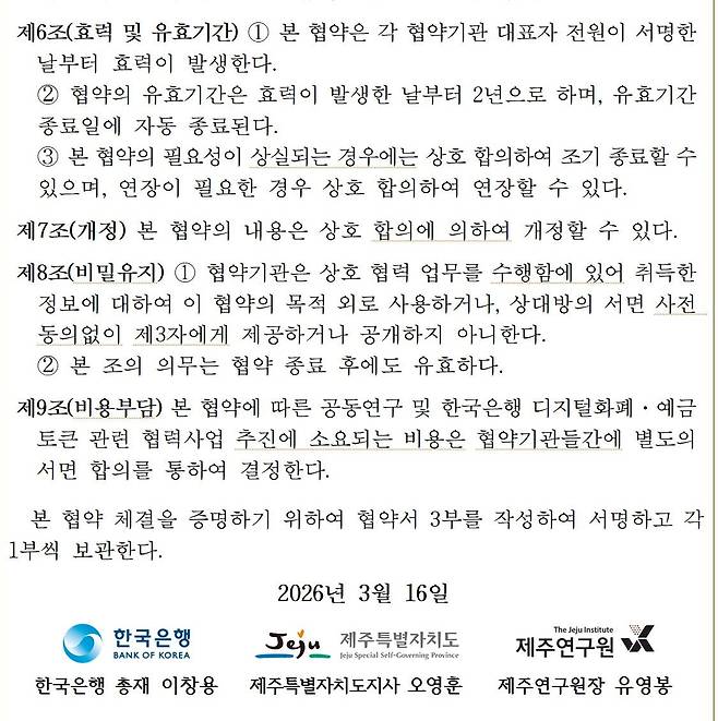 협약 기간은 총 2년이며, 소요 비용은 한은과 제주도 등이 추후 논의할 방침이다.