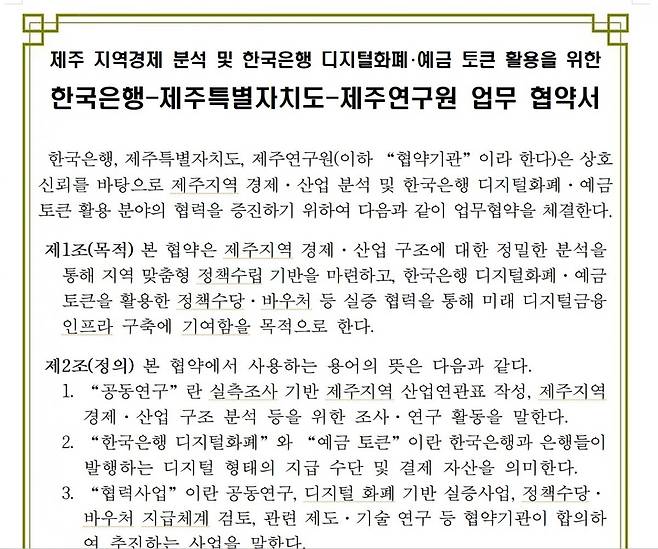 아울러 협약 이후에도 디지털화폐·예금 토큰을 활용한 공동 실증사업 추진을 위해 지속 협의한다는 내용이 포함돼 있다. 단순한 연구 교류가 아니라, 실제 활용 가능성을 제주 지역에서 시험해 보겠다는 뜻으로 해석된다.