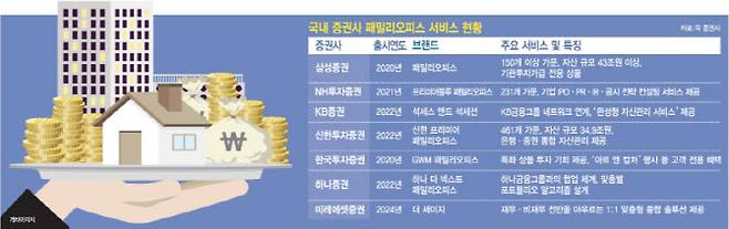 지난 2020년 서울 강남에 전용 센터를 열며 증권업계 패밀리오피스의 본격화를 이끈 삼성증권(016360)은 예탁 자산 300억원 이상, 투자 가능 자산 1000억원 이상의 고객을 대상으로 하는 ‘멀티 패밀리오피스’ 모델을 구축해 입지를 다지고 있다. 단순히 자산이 많은 개인 부자를 넘어, 하나의 기업급 자금력을 가진 가문을 파트너로 선별해 관리하겠다는 전략이다.