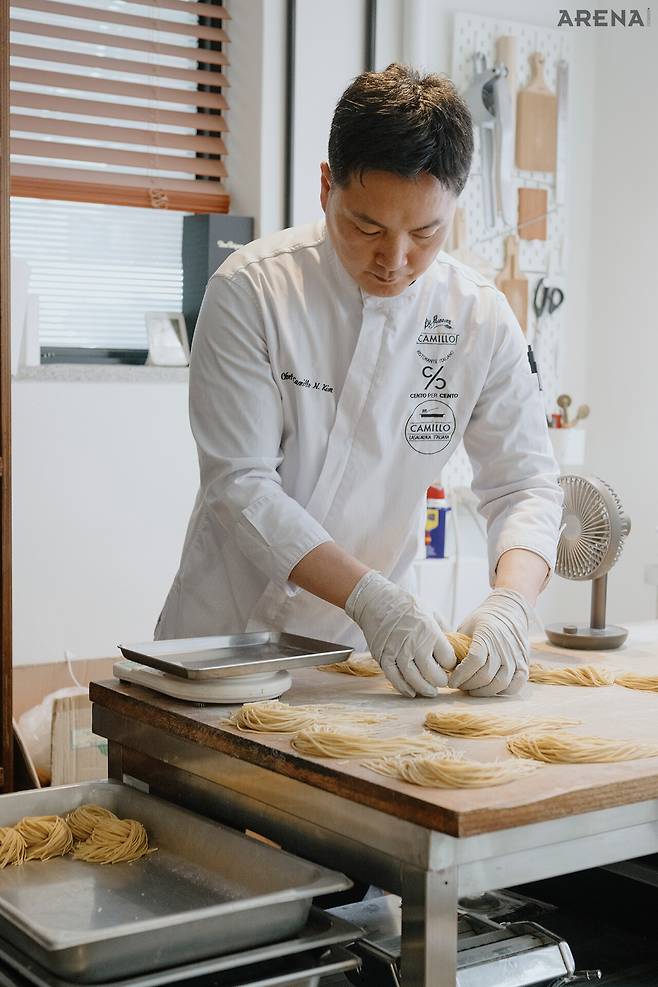 '식재료에 대한 깊은 애정, 그중에서도 면에 대한 각별한 집착에 가까운 열정을 지닌 인물이다.' <미쉐린 가이드>가 김도윤 셰프를 설명하는 첫 문장이다. 미쉐린 1스타 레스토랑 '윤서울'을 이끌고 있는 김도윤 셰프는 '면서울'을 연 이유로 '한국의 면을 보여주고 싶어서'라고 말했다. "우리나라는 아시아 국가 중에서도 면 소비량이 많은 나라 중 하나입니다. 그에 비하면 입맛은 편향돼 있어요. 한국 사람들은 면에서 다양한 식감을 찾기보다 탱글하고 쫄깃한 식감을 확실히 선호하죠. 쫄면이나 당면처럼요. 그런데 처음부터 그랬던 건 아니거든요." 면 요리는 조선시대 양반들이 먹던 고급 음식 중 하나였다. 하지만 일제강점기와 한국전쟁을 치르면서 '빠르고 배불리 먹을 수 있는 음식'으로 변해갔다. 부산의 밀면과 완당이 대표적인 예다. 반면 면서울에서는 단단한 면, 끊어지는 면, 부드러운 면 등 다양한 식감을 지닌 면을 만든다. 김도윤 셰프가 면서울의 대표 메뉴로 소개한 것은 '골동면'. 골동면은 과거 궁궐에서 각종 나물을 비벼 먹던 비빔밥의 옛 명칭인 '골동반'에서 따온 이름이다. 궁금증이 들었다. 왜 하필 나물일까? "나물 안 좋아하는 분들 많죠. 제 생각에는 단체 급식 시절부터였던 것 같아요. 대가족에서 핵가족으로 넘어가고, 맞벌이 부부가 많아지면서 아이들 입맛이 비엔나 소시지와 스팸으로 바뀌었어요. 제가 어릴 때만 해도 집집이 나물 반찬은 꼭 있었고, 아이들도 즐겨 먹었거든요. 우리가 잊고 지내던 한식의 매력을 국수에 담고 싶었습니다." 면서울의 제면 과정에는 통밀가루, 물, 소금을 제외한 어떤 첨가제도 들어가지 않는다. 첨가제가 들어가면 면의 탄력을 잡는 데는 유리하지만 소화를 방해해 속이 더부룩해진다. 면서울은 첨가제를 쓰지 않고도 면의 찰기를 잡기 위해 반죽을 접고 펴는 과정을 여러 번 반복한다. 소금은 충남 태안에서 공수한 자염을 쓰는데, 어패류가 많은 갯벌에서 채취한 덕분에 미네랄 함량이 높아 감칠맛이 뛰어나다. 1분 20초 동안 삶아낸 면 위에는 전국 각지에서 캔 나물을 엄선하여 올린다. 4월에는 고사리, 5월에는 죽순, 6월에는 취나물을 주로 쓰는데, 이날 완성된 골동면에는 청학동에서 따온 표고버섯과 고사리가 올라갔다. 경남 하동에 위치한 청학동은 해발 800m 고지대라 나물이 부드러운 것이 특징이다. 면을 삶던 노창식 셰프는 면서울의 히든 메뉴인 '안성제면'도 함께 먹어보라며 바쁘게 손을 움직였다. 안성제면은 골동면보다 약 두 배 더 널찍한 면을 쓴다. 고명으로는 들기름을 짜고 남은 깻묵, 태안에서 가져온 유기농 김 가루, 숭어 알로 만든 어란, 다진 한우 소고기, 간장에 조린 표고버섯이 올라간다. 문득 궁금증이 들었다. 김도윤 셰프는 라면을 얼마나 자주 먹을까? 안경을 만지작거리던 그는 이렇게 답했다. "정말 스트레스받을 때 한 번씩 먹어요. 어렸을 때부터 소화가 잘 안 돼서 즐겨 먹진 못합니다." 그런 김도윤 셰프에게 좋은 국수는 어떤 국수냐고 묻자 이런 답변이 돌아왔다. "속 편한 국수가 좋은 국수라고 생각해요. 그래야 다음 날 또 먹을 수 있으니까요. 자주 먹어도 물리지 않으려면 식감도 다양해야 할 테고요. 불닭볶음면 말고도 한국에 매력적인 국수가 정말 많다는 걸 보여주고 싶습니다."