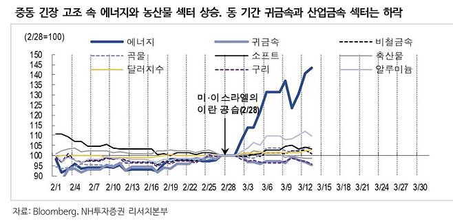 황병진 NH투자증권 연구원은 “이란을 둘러싼 중동 긴장과 호르무즈 해협 봉쇄 영향으로 에너지 가격 상승세가 이어지고 있다”며 “인플레이션 재점화 가능성과 통화정책 불확실성이 원자재 섹터별 흐름을 가르고 있다”고 밝혔다.