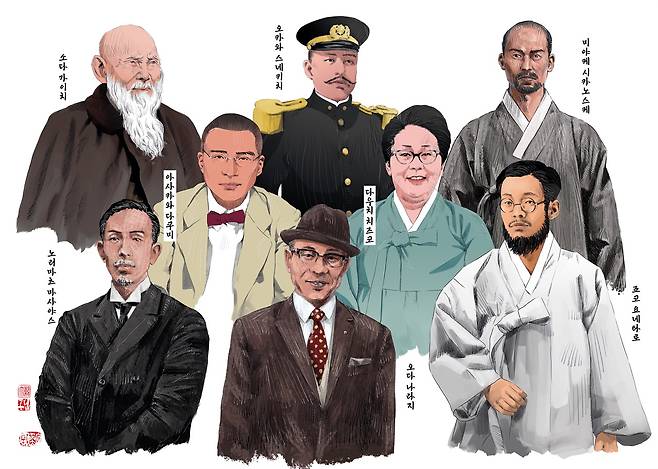 | ▲ 그 시절 조선인을 도운 일본인 조선의 고아를 보살펴준 소다 가이치와 다이치 치즈코. 관동대지진때 조선인들의 목숨을 구해준 오카와 스네키치, 조선에 대한 속죄의 마음으로 선교한 노리마쓰 마사야스와 오다 나리지. 조선인을 아낀 교육자 죠코 요네타로. 경성제국대학에서 반제국주의를 외친 미야케 시카노스케. 조선의 도예를 사랑한 아사카와 다쿠미 |