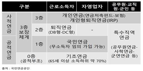 이에 우리나라는 노후의 안정적인 경제활동을 위한 노후연금소득을 다층 구조로 보장하고 있다. 노후에 기초적인 생활을 위한 국민연금이 1층을, 노후의 안정적 생활을 위한 퇴직연금(DB형·DC형)이 2층을, 노후에 여유있는 생활을 위한 개인연금(연금저축신탁·펀드·보험)과 개인형 퇴직연금(IRP)이 3층을 구성한다. 공무원·군인·사학연금과 같은 직역연금은 국민연금의 1층과 퇴직연금의 2층을 합친 구조이다. 공적부조 성격인 기초연금(65세 이상 소득 하위 약 70% 지급)은 0층을 구성한다.