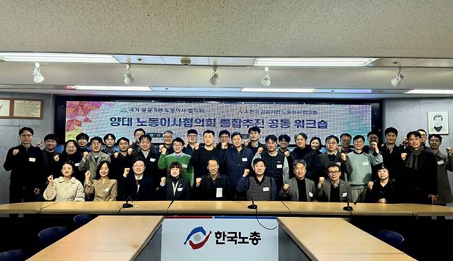 | ▲ 양대노동이사협의회 통합추진 공동 워크숍 단체사진 국노협-공노이협 노동이사들이 통합 추진 워크숍을 마치고 함께 사진촬영을 하고 있다. |