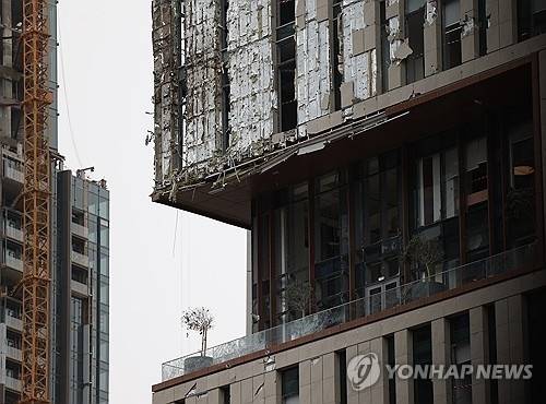 [이란 드론 요격 파편에 맞아 손상된 두바이 DIFC 건물 (EPA=연합뉴스 자료사진)]