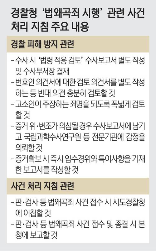 이날 문화일보 취재 결과, 경찰청이 지난 12일 전국 시·도경찰청에 내려보낸 지침엔 수사를 하다 법왜곡죄로 고발당하는 경우에 대한 예방·대처 방안이 주로 담겼다. 법왜곡죄(형법 제123조의2)는 판사·검사·수사관이 의도적으로 법령을 적용하거나 적용하지 않는 방식으로 재판·수사 결과에 영향을 미친 경우, 재판·수사 과정에서 증거를 인멸·은닉·변조한 경우, 적법한 증거 없이 범죄사실을 인정한 경우, 위법하게 증거를 수집한 경우 등을 10년 이하 징역형으로 엄벌하는 내용이다.