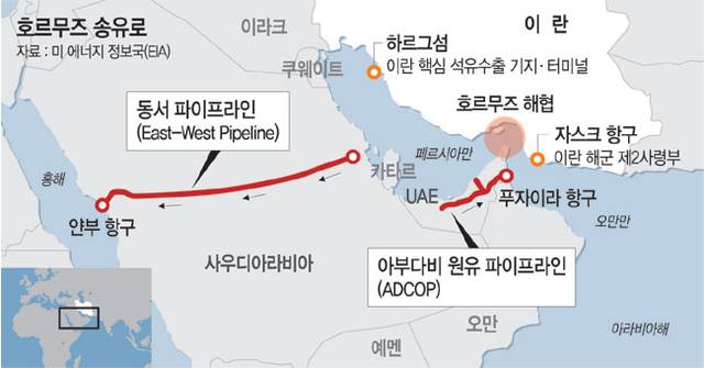 호르무즈 해협 봉쇄 가능성이 거론되면서 중동 산유국들이 구축해 온 ‘페르시아만 육상 우회 수송로’에 관심이 집중되고 있다. 호르무즈 우회 송유로는 페르시아만에서 생산된 원유를 홍해나 오만만으로 보내는 송유관으로, 사우디아라비아의 ‘동서 파이프라인(East-West Pipeline)’과 아랍에미리트(UAE)의 ‘아부다비 원유 파이프라인(ADCOP)’이 대표적이다. 다만 최근 이란이 ADCOP 푸자이라 항구를 공격하자 우회 수송망 역시 지정학적 위험에 노출돼 있다는 분석이 나온다.