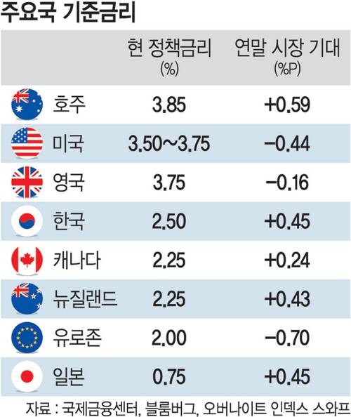 일본은행은 지난 2024년 7월부터 세 차례 기준금리를 인상하며 인상 기조를 이어가고 있고 호주 중앙은행도 고물가에 지난달 기준금리를 올리며 인상 기조로 돌아선 바 있다.