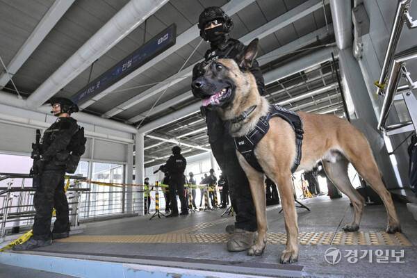16일 평택시 평택지제역에서 열린 '평택시 민·관·군·경·소방 통합훈련 다중이용시설 테러 대응 통합방위훈련'에서 경찰견을 대동한 경기남부경찰청 경찰특공대원들이 폭발물 주변으로 경계를 서고 있다. 이번 훈련은 폭발물 설치 상황을 가정해 민·관·군·경·소방이 함께 시민 대피와 폭발물 해제 등 상황에 실시간으로 공동 대응하는 방식으로 진행됐다.