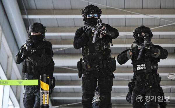 16일 평택시 평택지제역에서 열린 '평택시 민·관·군·경·소방 통합훈련 다중이용시설 테러 대응 통합방위훈련'에서 경기남부경찰청 경찰특공대원들이 폭발물 위치로 출동하고 있다.