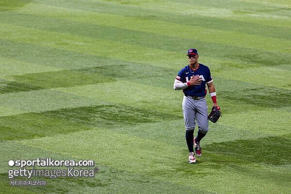 '슈퍼 캐치' 이후 나온 특유의 '비행 금지 구역(No Fly Zone)' 셀러브레이션에 경기장이 달아올랐다. 하지만 미국도 뒤지지 않았다. 6회 말 매니 마차도의 안타성 타구를 유격수 바비 위트 주니어가 깔끔하게 건져냈다.