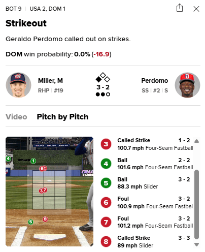 하지만 심판이 삼진을 선언하며 어처구니없는 오심과 함께 경기가 끝났다. 이보다 심한 '용두사미' 엔딩을 찾기 힘든 수준이다. "오늘 미국 최고의 선수는 심판", "가장 뜨거운 경기에서 나온 수치스러운 판정", "멋진 경기를 끝내는 가장 역겨운 방법" 등 수많은 비난이 SNS에서 쇄도하는 건 당연한 결과다.