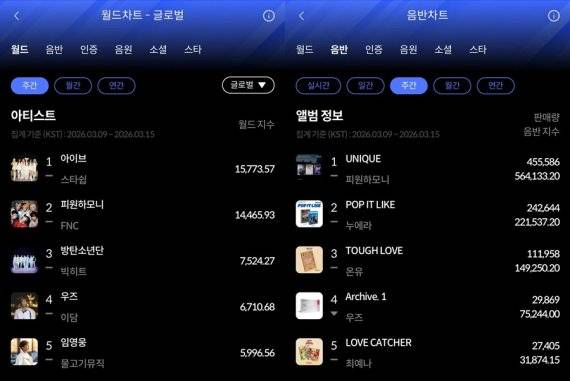 세계 유일의 실시간 음악차트인 한터차트는 16일 오전 10시, 2026년 3월 2주 차 주간차트를 발표했다. 이에 따르면 아이브와 피원하모니가 한터차트 3월 2주 차 월드차트와 음반차트에서 각각 1위에 올랐다.