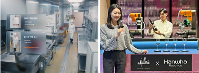 AI 카메라에 이상 상황이 포착되면 직원에게 곧바로 알림을 보내 대응하도록 하는 시스템도 구축한다. 각 사 F&B 부문은 비노봇(VINOBOT), 조리로봇과 같이 한화로보틱스의 협동로봇을 고객 서비스에 활용한다는 방침이다.