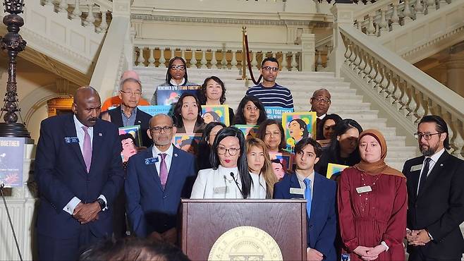 | ▲ 3월 16일, 조지아주 의사당에서 열린 3.16 애틀란타 총격사건 추모 5주기 기자회견. 김백규 조지아한인식품협회장, 미쉘강 주의원후보, 사라박 둘루스 시의원 등이 참여했다. 조지아 주 하원의원 미셸 아우가 발언 중이다. |