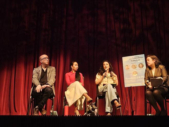 | ▲ 패널 토론자들 (왼쪽부터) 스콧 쿠라시게 교수, 케리 리 예술감독, 스테파니 조 민주주의랩대표, 사라 박 둘루스 시의원 (사회) |