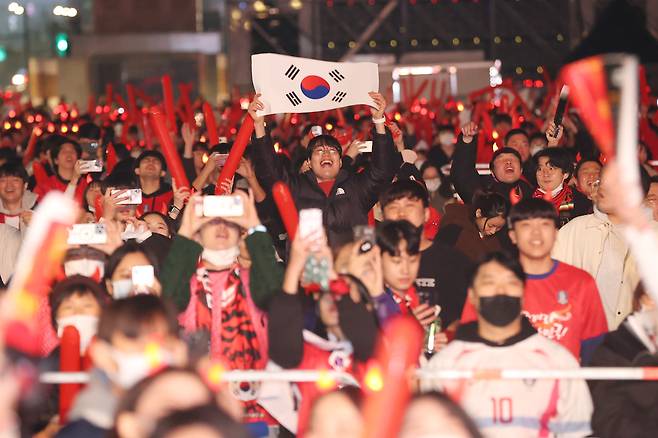 | ▲ 서울 종로구 광화문광장 육조마당에서 2022 카타르 월드컵 조별리그 H조 1차전 대한민국과 우루과이의 경기를 보며 축구팬들이 환호하고 있다. 2022.11.25 |