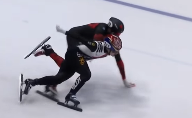 2002 솔트레이크시티 올림픽에서 김동성이 남자 1000m에서 맨 먼저 들어와 태극기 세리머니를 하다가 심판의 석연 찮은 페널티 판정으로 홈링크 아폴로 안톤 오노에게 금메달을 억울하게 넘겨준 사건이 생각나는 한 판이었다.