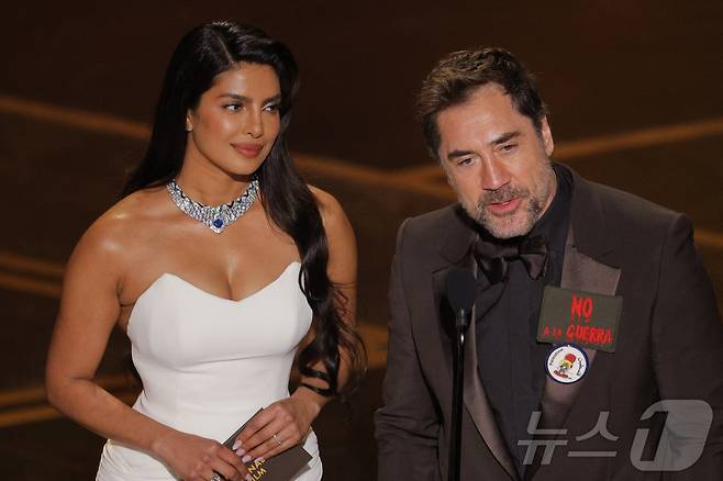 (로스앤젤레스 로이터=뉴스1) 윤다정 기자 = 15일(현지시간) 미국 캘리포니아주 로스앤젤레스(LA) 할리우드에서 열린 제98회 아카데미 시상식에서 배우 하비에르 바르뎀(오른쪽)이 '전쟁을 멈춰라'(NO A LA GUERRA)라는 스페인어 문구를 가슴에 착용하고 배우 프리양카 초프라와 함께 무대에 올라 발언하고 있다. 2026.03.15.