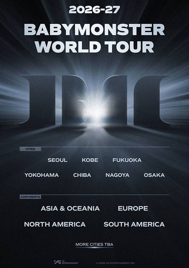 YG엔터테인먼트는 16일 공식 블로그에 '2026-27 베이비몬스터 월드 투어 어나운스먼트(2026-27 BABYMONSTER WORLD TOUR ANNOUNCEMENT)'를 공개했다. 앞서 양현석 총괄 프로듀서가 예고한 대로 오는 6월부터 진행될 월드투어의 윤곽이 베일을 벗은 것이다.