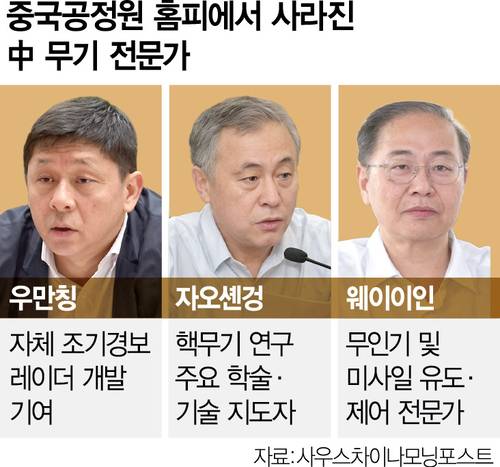 16일 홍콩 사우스차이나모닝포스트(SCMP)에 따르면 중국 국무원 산하의 공학기술계 최고 학술 기관인 중국공정원 홈페이지에서 자오셴겅(72) 전 중국공정원 부원장을 포함한 원사 3명의 이름이 지워졌다. 자오 전 부원장과 함께 레이더 전문가 우만칭(60)과 미사일 전문가 웨이이인(63) 등도 명단에서 사라진 사실은 중국 현지 매체들의 보도를 통해 알려졌다.