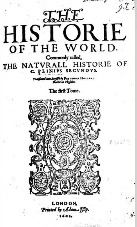 | ▲ 플리니우스의 <박물지(Naturalis historia>를 영어 번역본 <세계의 역사> 필레몬 홀랜드 번역, 런던, 1601년. (출처: 인터넷 아카이브) |