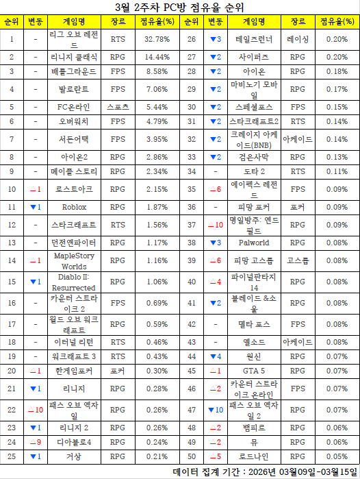 한 주간의 PC방 순위를 되짚어 보고, 어떤 변화가 있었는지 알아보는 'PC방순위' 코너입니다. 데일리게임은 매주 PC방 순위를 일목요연하게 정리, 독자들이 알아보기 쉽도록 제공합니다. 지난 한 주간 어떤 PC 온라인게임들이 눈길을 끌었는지 살펴봤습니다. < 편집자주 >