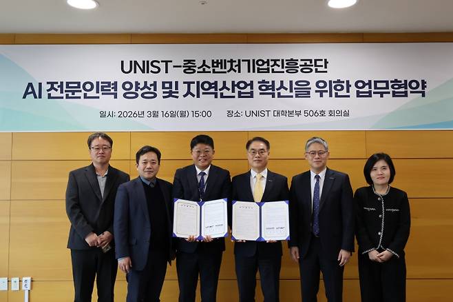 중소벤처기업진흥공단은 16일 UNIST에서 ‘중소기업 AI 전문인력 양성 및 지역산업 혁신을 위한 업무협약’을 체결했다.
