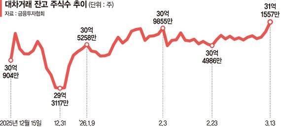 16일 금융투자협회에 따르면 국내 증시 대차거래 잔고 주식 수는 지난 13일 기준 31억1557만주 집계됐다.