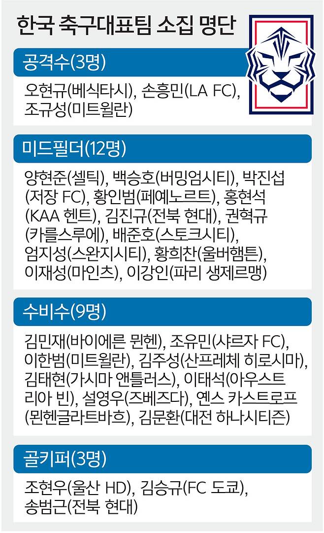 이번 명단은 해외 무대 경험이 풍부한 베테랑 자원들로 뼈대를 유지하면서도, 9개월 만에 대표팀에 소집된 양현준(셀틱) 등의 새로운 얼굴을 발탁해 대표팀에 ‘신구 조화’의 색채를 더했다. 또 미드필더와 측면을 모두 소화할 수 있는 홍현석(헨트)이 1년4개월 만에 대표팀에 돌아오게 됐다. 소속팀에서 경기에 좀처럼 나서지 못하고 있는 양민혁(코번트리)은 제외됐다.