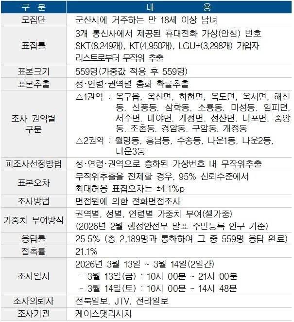 이어 김영일 현 군산시의회 새만금특별위원회 위원은 19%, 서동석 현 더불어민주당 정책위원회 부의장 10% 등을 기록했다.