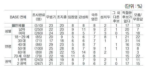 40대(23%)와 50대(28%)‧60대(22%)에서 각각 20% 이상의 지지를 얻은 조지훈 전 더불어민주당 원내대표 특보는 50대 남성(33%)에서 30% 이상의 지지를 받았다.