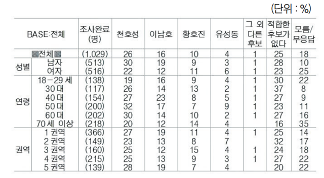 성별과 연령층을 분석했을 때 천호성 교수가 모든 성별과 연령층에서 앞선 것으로 조사됐다.