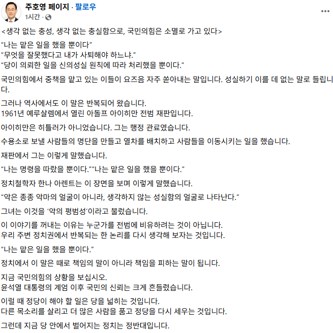 주 의원은 16일 페이스북에 ‘생각 없는 충성, 생각 없는 충실함으로, 국민의힘은 소멸로 가고 있다’라는 제목의 글을 올리며 이 위원장 복귀 후 국힘 공관위에서 대구시장 출마를 선언한 중진들을 배척할 것을 감지한 듯 작심 비판했다.
