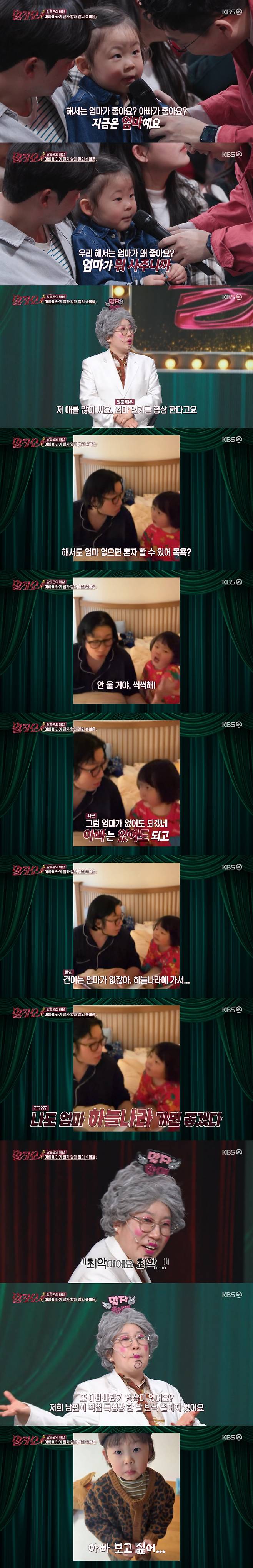 이어 김영희는 "건희는 엄마가 없다. 하늘나라에 가서"라며 책에 몰입, 그때 해서 양은 "나도 엄마 하늘나라 가면 좋겠다"라고 말해 김영희를 당황하게 만들었다. 딸의 의도를 파악할 수 없는 답변에 김영희는 "최악이다"라고 해 웃음을 자아냈다.