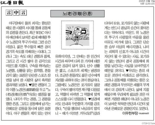 이 대통령이 함께 공유해 화제가 된 강원일보 이무헌 부장의 칼럼 역시 깊은 여운을 남긴다. 해당 칼럼은 야구팬들이 노 선수에게 붙여준 ‘노(老)경(敬)은(恩)’이라는 별명을 조명하며, 이것이 “나이가 주는 경륜, 그 경륜을 향한 존경, 그리고 공동체에 남기는 은혜로운 감동”을 뜻한다고 설명했다 . 또 “나이는 쇠퇴의 신호가 아니라 시간이 자산이 될 수 있다는 사실, 포기하지 않는 연단이 결국 공동체에 희망을 남긴다는 사실을 보여주었다”며 세월의 무게가 지니는 가치를 역설했다.