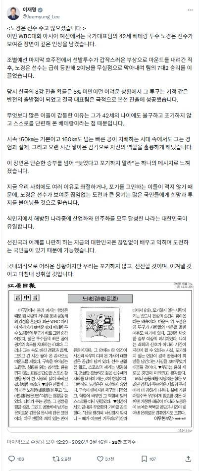 이재명 대통령이 자신의 소셜미디어(X·옛 트위터)에 최근 월드베이스볼클래식(WBC) 아시아 예선에서 투혼을 보여준 42세 베테랑 투수 노경은 선수를 극찬하는 글을 올려 화제를 모으고 있다.