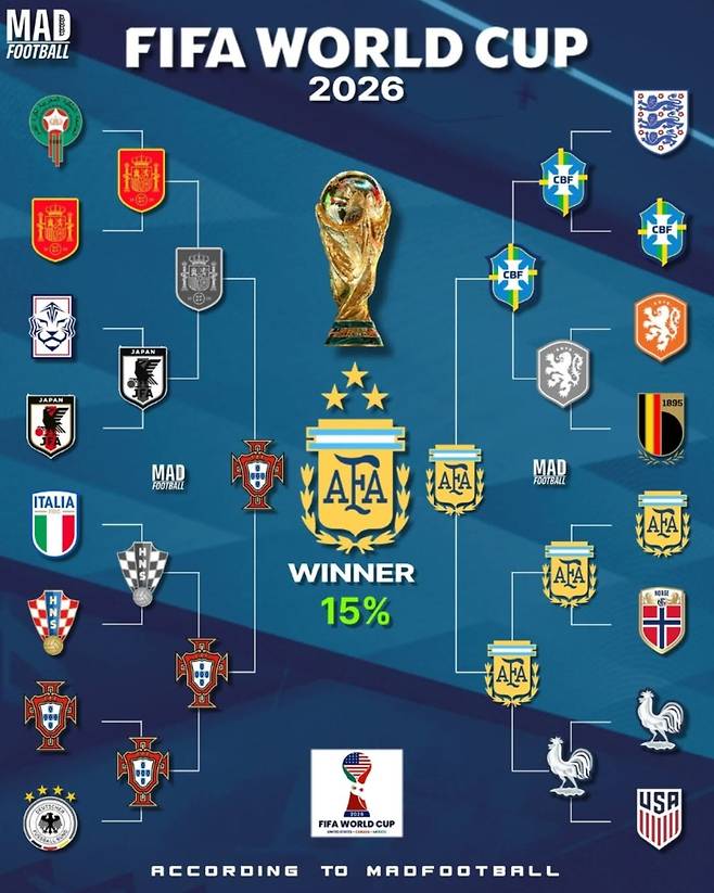 글로벌 축구매체 '매드풋볼'은 16일(한국시간) 사회관계망서비스(SNS)를 통해 챗GPT가 예상한 북중미 월드컵 토너먼트 대진표를 공개했다.
