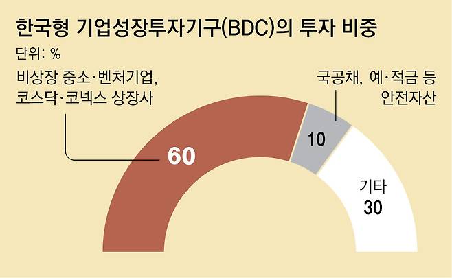 이러한 문제를 보완하기 위해 도입한 제도가 한국형 기업성장집합투자기구(BDC)다. BDC는 비상장사와 벤처기업에 투자하는 상장형 공모 펀드로 설계돼 17일부터 처음 시행된다. 한국거래소가 다음 달까지 시스템을 정비하면 자산운용사별로 BDC 상품을 내놓을 예정이다.