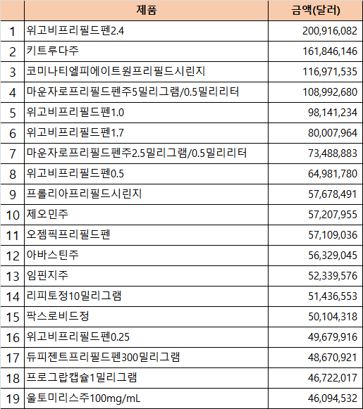16위에는 한국노보 노디스크제약 위고비 0.25mg이 4968만 달러 17위에는 사노피 아토피 치료제 듀피젠트 프리필드펜 300mg이 4867만 달러, 한국아스텔라스제약 프로그랍이 4672만달러치가 수입되면서 18위에 등극했다.