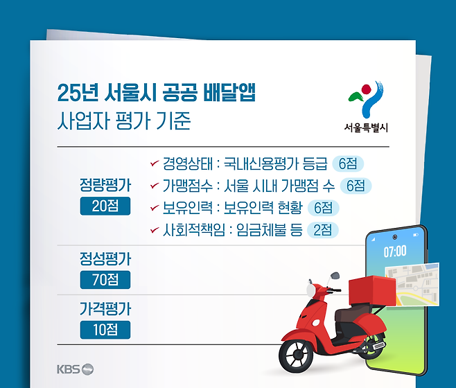 하지만, 이후 서울시가 공개한 '평가 기준'은 먹깨비 측을 좌절하게 했습니다. 평가 항목은 사실상 동일한 점수를 받는 '가격 평가(10점)'을 제외하면 '정량평가(20점)'와 '정성평가(70점)'로 구성됐습니다. 문제는 '정량평가'의 항목입니다. 국내 신용평가 등급을 기준으로 한 경영 상태, 서울시 내 가맹점 수, 보유 인력 현황 등이 주 내용이었습니다.