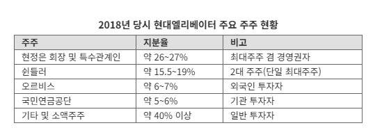 쉰들러는 당시 현대엘리베이터에 투자한 상태로 현정은 현대그룹 회장과 특수관계인을 제외하면 2대 주주인 상황이었다. 현정은 회장 및 특수관계인 지분이 27%였고, 쉰들러는 약 15%로 국민연금공단보다 3배나 많은 지분을 보유하고 있었다. 쉰들러는 한때 현대엘리베이터 지분을 약 35%까지 보유하며 경영권을 위협했으나 2013년~2015년 현대엘리베이터가 수차례 대규모 유사증자를 단행하며 지분율이 15%대까지 급락했다.