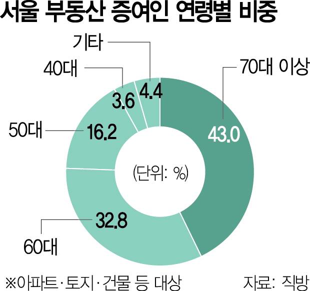서울과 인접한 경기도도 비슷한 양상을 보이고 있다. 2월 기준 경기도 증여인의 연령 비중은 70대 이상 41.17%, 60대 29.52%, 50대 17.86%, 40대 6.16%였다. 50·60대 합산(47.38%)이 70대 이상을 앞질렀다.