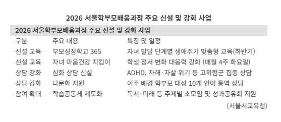 서울특별시교육청이 '부모성장학교 365'와 '자녀 마음건강 지킴이 교육' 등 맞춤형 프로그램을 담은 '2026 서울학부모배움과정'을 본격 시작한다.