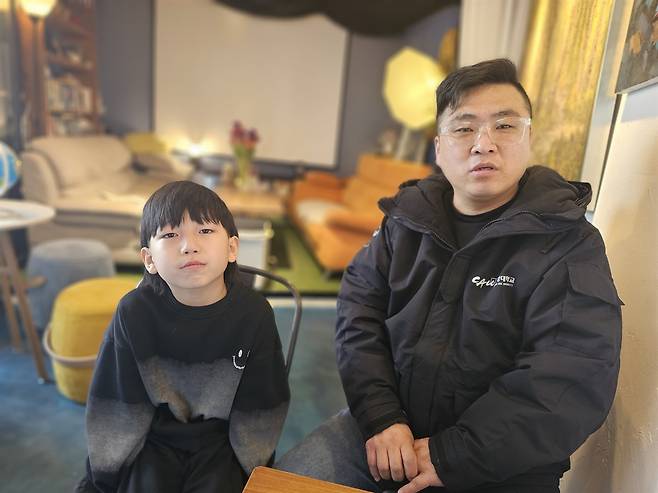 | ▲ 스포츠스태킹 국가대표 선발전에 도전하고 있는 서산 동암초등학교 2학년 조건형군(왼쪽)과 아버지 조병혁씨가 인터뷰에 응하고 있다. |