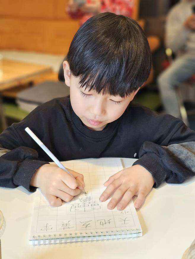 | ▲ 서산 동암초등학교 2학년 조건형군이 노트에 한자를 쓰고 있다. 건영군은 어릴 때부터 한문에 관심을 보여 천자문을 스스로 익혔다. |
