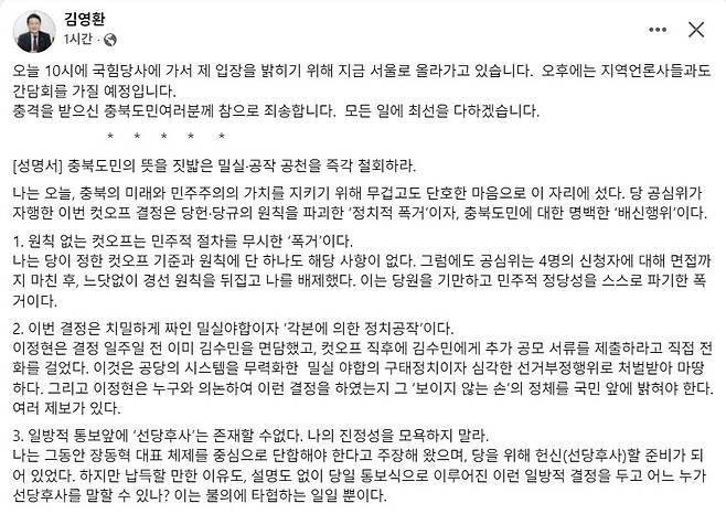 충북지사 선거 국민의힘 공천에서 배제된 김영환 지사가 이틀째 강한 반발을 이어가고 있습니다.