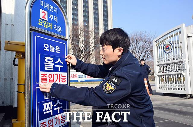 [더팩트ㅣ임영무 기자] 고농도 초미세먼지 대응을 위한 비상저감조치가 시행된 17일 오전 서울 종로구 정부서울청사 출입차량에 2부제가 시행되고 있다.